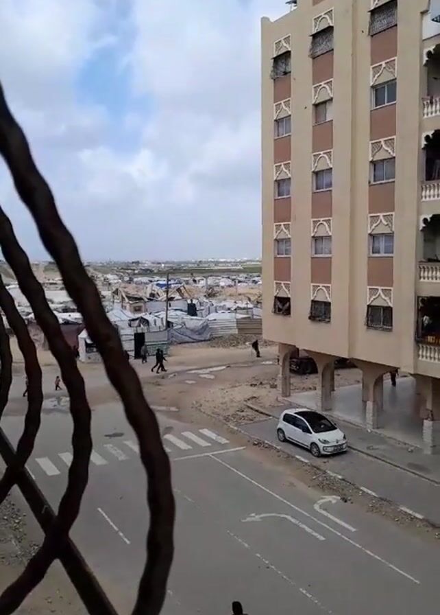 The video, shot from an elevated position looking through a brown-painted metal trellis, presents a street scene with a tall, tan-colored building raised on stilts dominating the right side of the frame. A white car is parked underneath the building. Across the street, on the left side, is a sprawling area of tents and makeshift shelters, suggesting a refugee or displaced persons camp. Several people are seen walking in the camp and on the street. A lone individual walks along the street away from the camera. The sky is partly cloudy. The camera is being held by a person whose hand and a portion of a black smartphone are visible as they attempt to take a photo or video of the scene.
