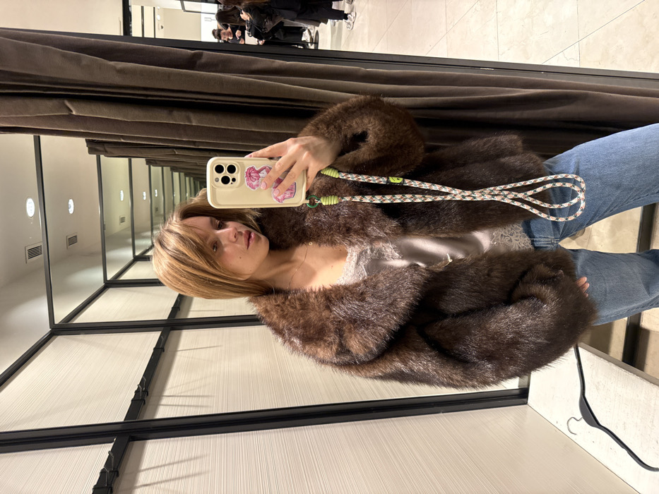 In a dressing room with mirrors, a person wearing a brown fur coat, light blue jeans, and a delicate top poses while holding a phone in their right hand. The phone has a beige case with a flower sticker and a white braided strap with green accents. The person has light brown hair with bangs and is wearing a necklace. Clothes are visible in the background, hanging behind a brown curtain. A black hanger is present in the lower right corner of the image.