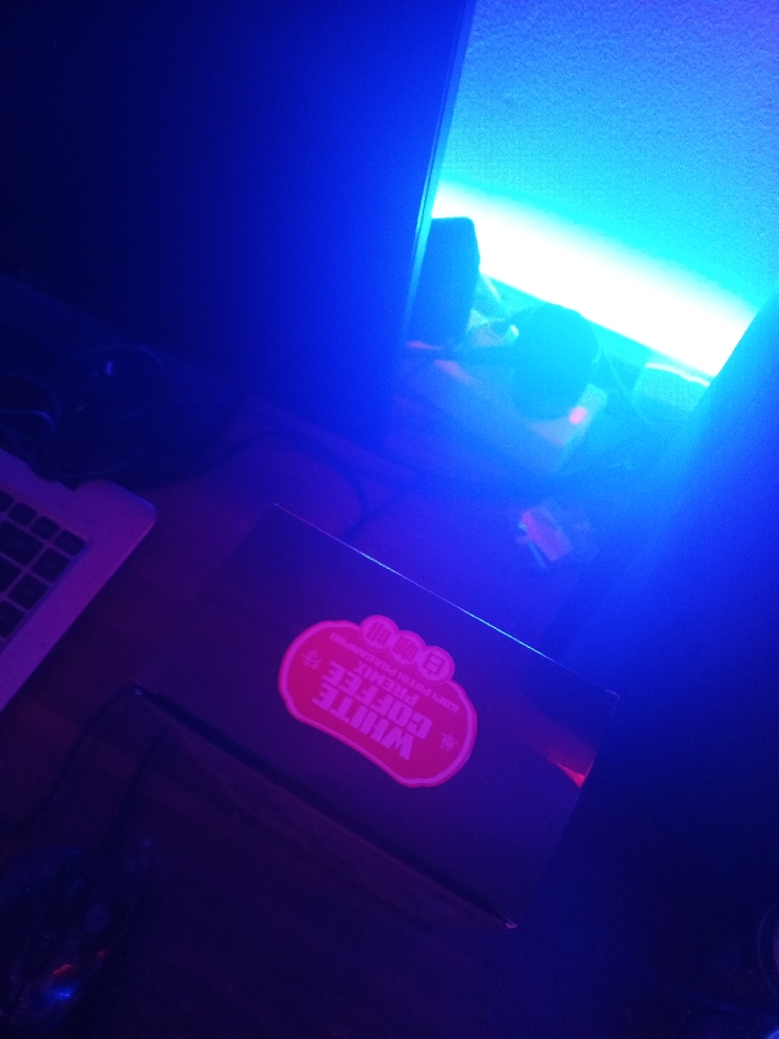 dimly lit workspace with strong blue lighting. A laptop with a "White Coffee" sticker rests on a dark surface, near a keyboard. Headphones are also visible, positioned near the monitor. A glowing light source illuminates the upper right portion of the frame.
