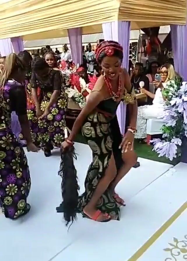 At an outdoor event venue, a woman in a black and green strapless dress with a high slit and red beaded jewelry dances on a white platform, holding a dark accessory. Other women dressed in matching floral print dresses with black lace details stand nearby. The event space is decorated with a beige awning, purple fabric, floral centerpieces, and sparklers placed along the platform edge. People are seated at tables in the background, observing the performance.