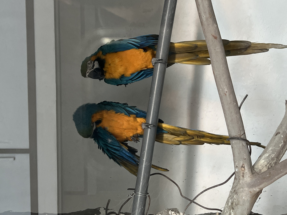 This image depicts two Blue-and-Yellow Macaws (Ara ararauna) perched within an enclosure located in Barza Municipality, Syria