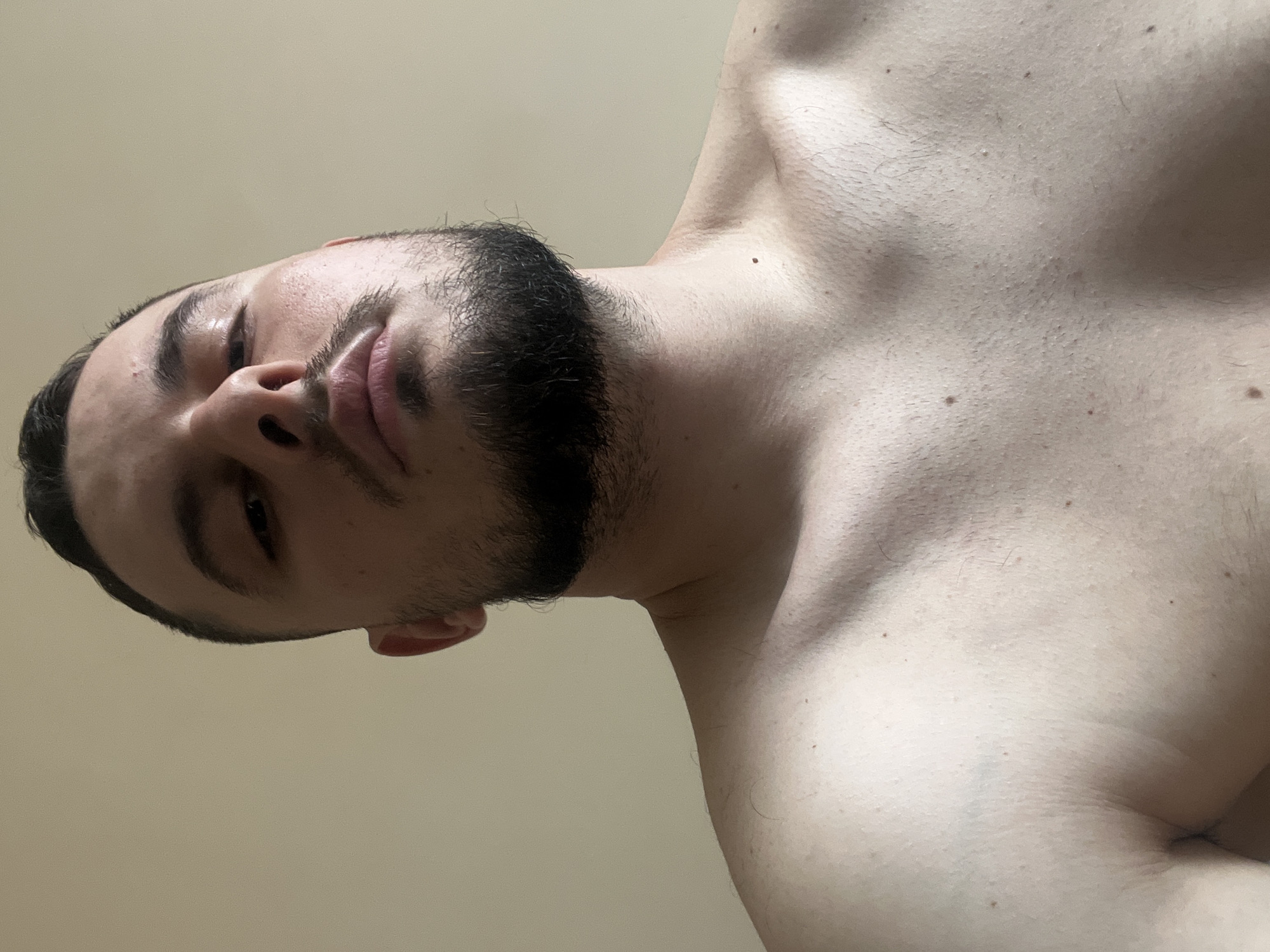 A close-up shot of a man's face and upper torso from a low-angle perspective. The man has dark hair, a beard, and fair skin. He is shirtless, revealing his chest and shoulders. The background is a plain, light-colored wall. The angle gives a sense of looking down on the man. No information indicates the location is Burgas, Bulgaria.