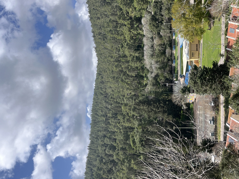 The image presents an elevated view of a landscape in Al Jizah, Jordan, under a partly cloudy sky with visible blue patches. A large, densely forested hill, predominantly covered with evergreen trees, occupies the background. Below the forest, a recreational complex is situated, featuring at least two swimming pools; one large pool is covered by a blue tarp, and a smaller one remains uncovered. An adjacent, light-colored building stands near the pools. To the left of the complex, a paved parking lot contains two visible vehicles, one white and one dark-colored. Multiple light poles are present within this area, and a wall near the parking lot exhibits graffiti. A green lawn borders the pool complex. In the foreground, bare deciduous tree branches are visible on the left, and the orange-red tiled roofs of residential buildings are partially observable at the bottom of the frame. No persons are depicted.