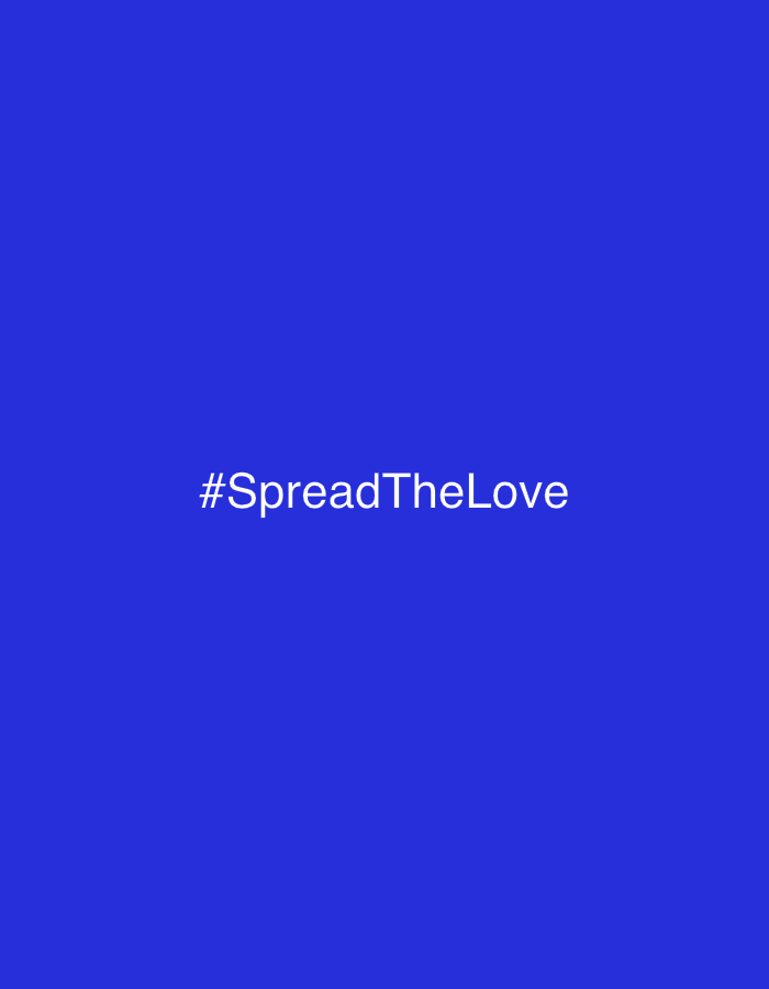 The image displays a solid royal blue background. Centered horizontally and vertically on this background is the white text: "#SpreadTheLove". There are no discernible people, subjects, objects, actions, interactions, or environmental details present. The image contains no visual information to determine a specific physical location, including any city like Tel-Aviv, Israel.