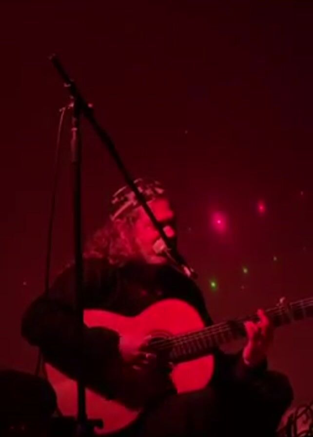 musician sitting and playing a classical guitar on stage under red lighting. A microphone stand sits to his left. The musician has long, curly hair and wears a patterned headband. He is wearing a black shirt. There are green and red laser dots in the background. A dark figure briefly crosses the bottom left corner of the screen at the end.