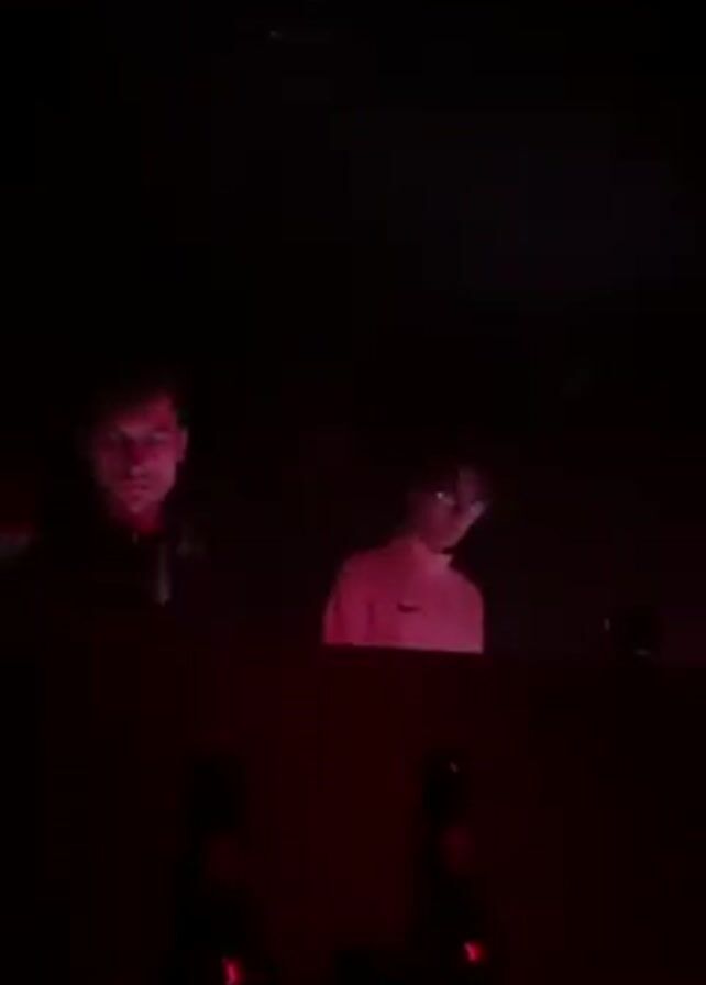 Two people, possibly DJs, are seen behind a bar-like structure