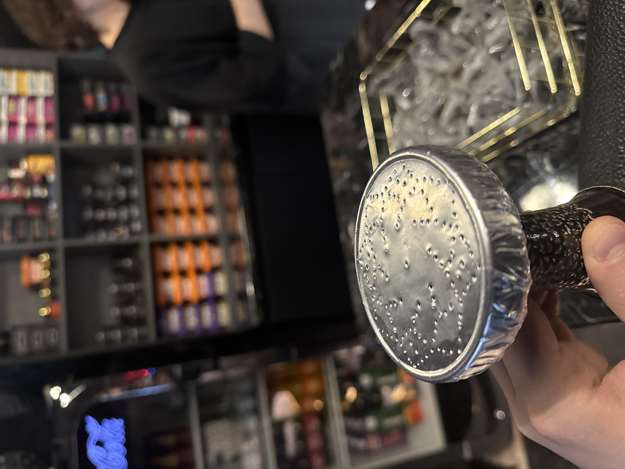 The image depicts an interior scene, likely a hookah lounge or a specialized tobacco/shisha store in Krasnoyarsk, Russia. In the immediate foreground, a human hand, primarily the thumb, index, and middle fingers, grips the stem of a dark-colored hookah bowl. The bowl itself is covered with a circular piece of crimped aluminum foil, which has numerous small, evenly distributed perforations on its surface. To the right of the hookah bowl, in the midground, rests a rectangular, open-top metallic basket, appearing brass-toned, filled with multiple individually wrapped, clear plastic hookah mouth tips. To the left of the central subject, a refrigerated display unit is visible. Its upper section features a blue neon sign spelling "Coca-Cola." Below the sign, various bottled beverages are arranged on shelves inside the illuminated cooler. In the blurred background, a shelving unit extends across the frame, stocked with numerous retail products in small containers or packages, likely shisha tobacco or related accessories, distinguished by various colorful labels (e.g., orange, purple, white). To the far right background, a person with short, dark, curly hair, wearing a dark short-sleeved shirt, is partially visible from the chest up, facing away from the camera. The setting suggests a commercial establishment.