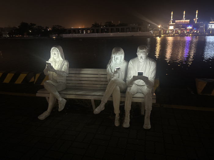 The image displays a nighttime scene along the Love River in Kaohsiung, Taiwan, featuring a public art installation. Three light-colored, full-size humanoid statues are seated on a light-colored, slatted bench. From left to right: a female statue wearing a hooded jacket and pants, a female statue with long hair wearing a top and pants, and a male statue in a long-sleeved shirt and pants. Each statue is depicted looking intently at a smartphone held in both hands, with the device screens emitting bright white light that illuminates their faces and upper bodies. The bench is positioned on a dark, patterned paved surface adjacent to the river. Beyond the statues, the dark water of the Love River reflects the colorful artificial lights from several illuminated buildings on the opposite bank. A prominent building on the right displays the Chinese characters "天鵝" (Swan). On the far left, a yellow and black striped barrier is partially visible at the water's edge.