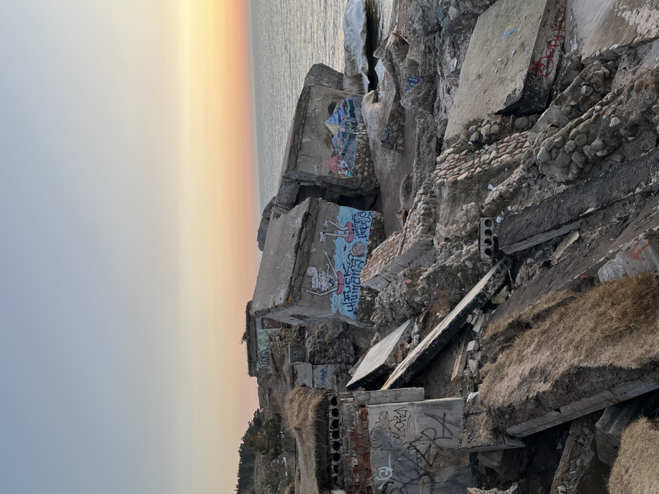 This image depicts the collapsed coastal fortifications of Karosta in Liepaja, Latvia, at sunrise or sunset
