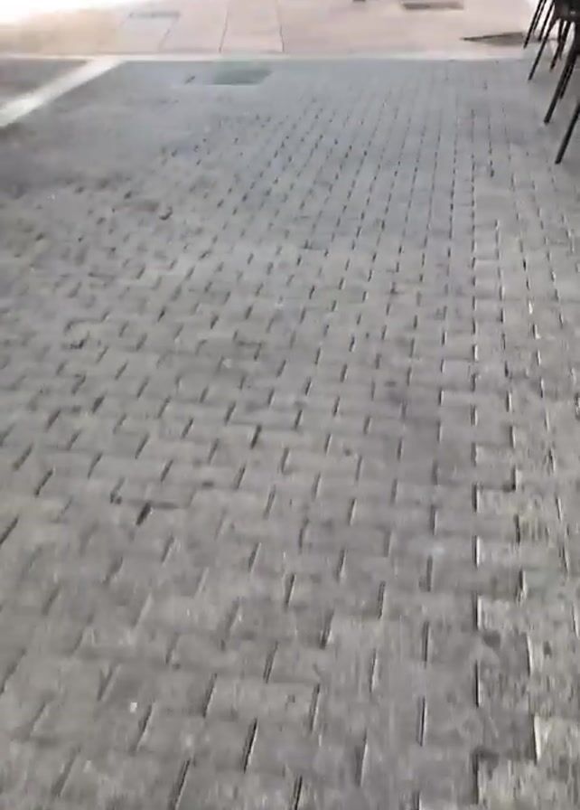 street scene with a large Christmas tree in the center of the square. Several people are walking around, including one man walking a small black dog. The street is paved with grey bricks, and there are buildings on either side. There are tables and chairs set up outside what appears to be a cafe or restaurant. The sky is clear and the sun is shining.