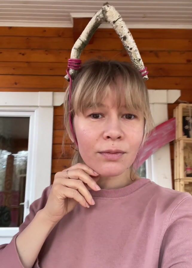 A young woman stands on a porch. She wears a pink sweatshirt and has a triangular birch branch contraption attached to her head with pink ties. She is looking at the camera and touching her chin and face. Behind her are a wood-paneled wall, a white door, and some shelves with items. The background is slightly out of focus.