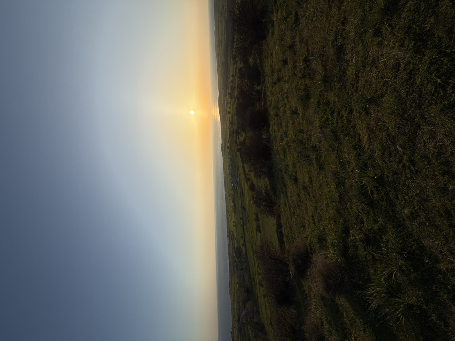 The image displays an elevated panoramic view of a coastal landscape at either sunrise or sunset, situated near Alonia, Greece. The upper sky is clear, transitioning from a deep blue overhead to a lighter blue and then a warm orange-yellow hue at the horizon. A circular, intensely bright sun is positioned on the horizon, slightly right of the vertical center, casting a distinct, shimmering reflection across the surface of the calm body of water below. This body of water occupies the mid-ground, extending towards a distant coastline. Between the foreground and the sea, a strip of land features numerous green, cultivated agricultural fields, appearing as segmented patches, interspersed with scattered dark-foliage bushes or small trees. The immediate foreground consists of a gently sloping grassy hillside, predominantly green with visible clumps of darker green vegetation and occasional patches of drier, lighter-colored grass and low-lying shrubs. Shadows are elongated, consistent with a low sun angle. No individuals, man-made structures, or specific actions are identifiable within the frame.
