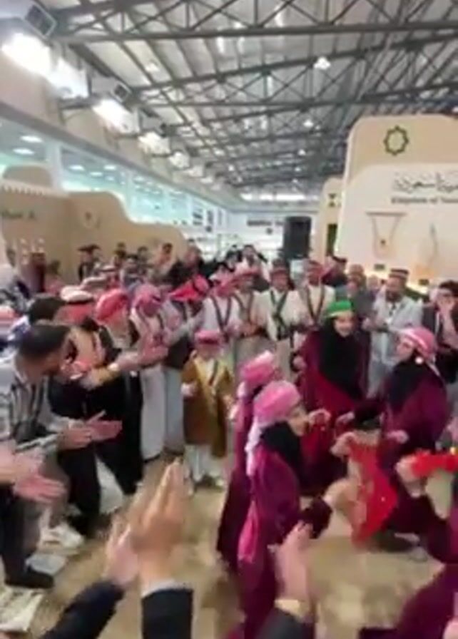 A group of people are gathered indoors, clapping and cheering as some children dressed in maroon robes and pink head coverings dance in a circle. Most of the adults are dressed in traditional Saudi attire, including thobes and headscarves. The setting appears to be a cultural exhibition, with displays showcasing the Kingdom of Saudi Arabia. The building has a high ceiling with visible metal beams and industrial lighting.