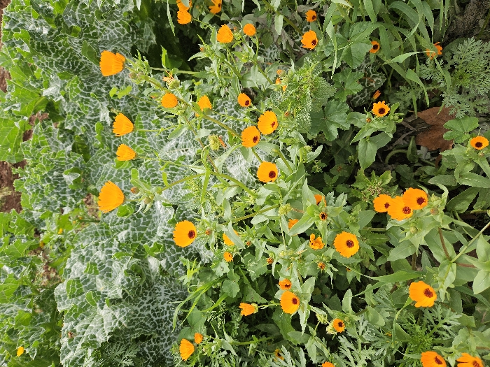 The scene depicts a dense patch of vibrant flora located in the city of Fez, Morocco. The foreground and midground are dominated by numerous orange calendula (pot marigold) flowers, each exhibiting a distinct dark brown or reddish-brown central disk. These flowers are supported by green stems with lance-shaped leaves. Interspersed and forming a significant portion of the background are large, serrated green leaves characterized by prominent white, mottled vein patterns, consistent with Milk Thistle (Silybum marianum). Additional generic green foliage fills the remaining areas, creating a lush, verdant environment. No individuals, animals, or man-made structures are visible within the frame. The lighting suggests an outdoor, natural setting.