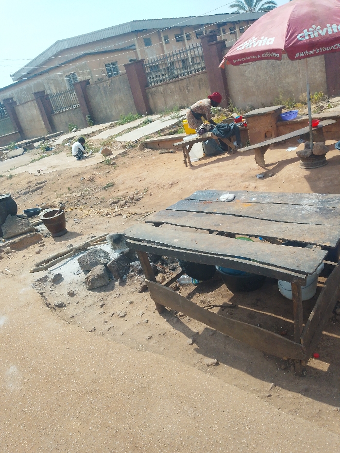 A street scene shows a woman in a red headscarf doing laundry behind a “Chivita” umbrella. A child sits nearby. In the foreground, a rustic wooden table stands on a dirt-covered ground with buckets underneath. To the left, a makeshift cooking area with stones, sticks, and pots is visible. A building with a fence is situated in the background.