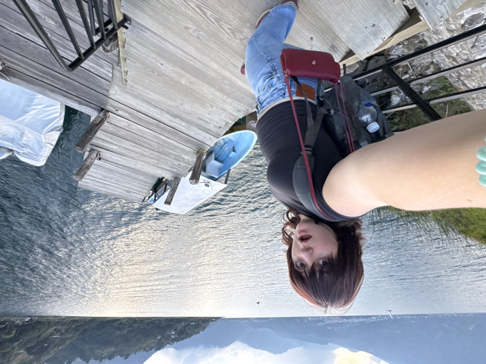 A person with dark brown hair and bangs, wearing a black top and jeans, stands on a wooden dock. They have a red purse and a backpack. A small blue boat is docked nearby. Below the dock, the water shimmers. In the background, a mountain range stretches across the horizon under a cloudy sky. The image is taken from a high angle, rotated so the person appears upside down.