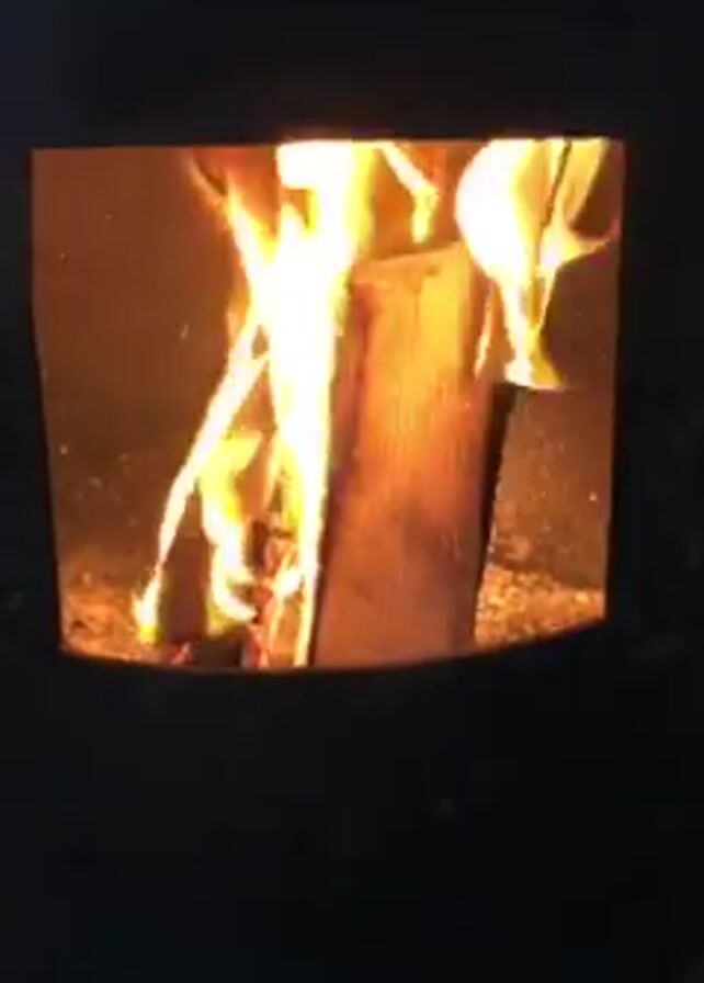 A wood-burning stove is shown in a close-up shot