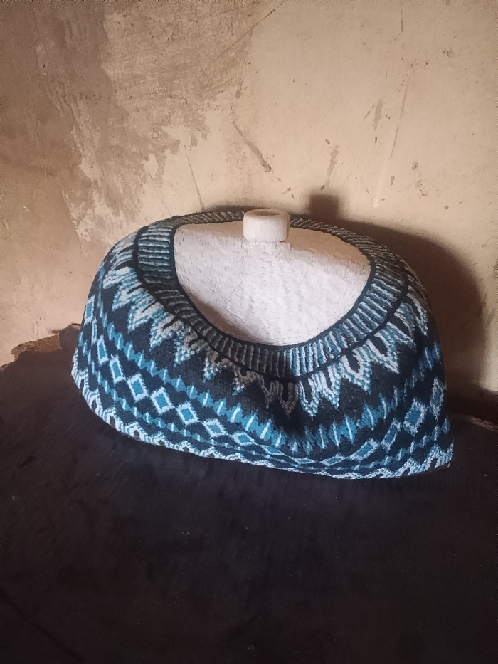 - "The image displays a single, intricately knitted cap on a white head-form, situated indoors in the city of Unknown, Unknown" by FM-2CNDq1, licensed under CC BY 4.0