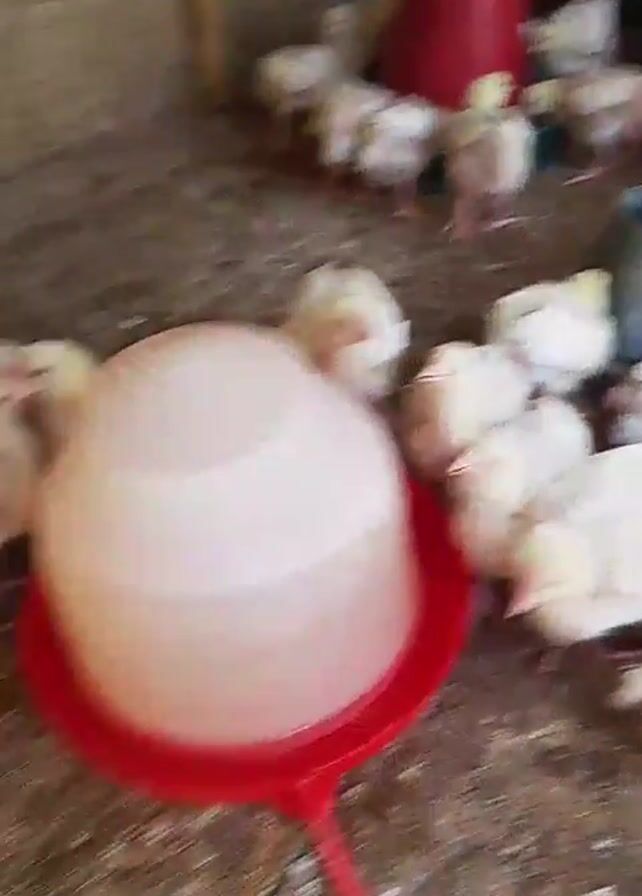 group of small, white chicks clustered together in a brooder. There are several water feeders scattered around them. The chicks are drinking from the feeders and moving around within the enclosed space. The brooder appears to be a small indoor space with concrete floors and wooden supports. The person speaking mentions that the chicks are two weeks old.