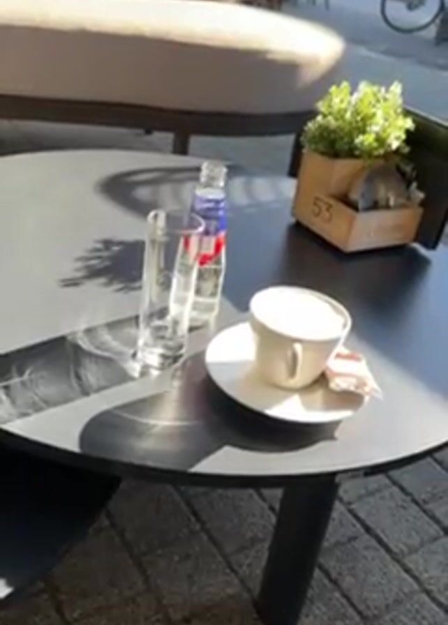 table outside a cafe. On the table is a glass, a small bottle of water, a cup of coffee on a saucer with a sugar packet, and a small wooden planter with artificial greenery and a card stand in it. There is outdoor seating in the background. Bicycles are visible on the sidewalk. The camera pans around the table.