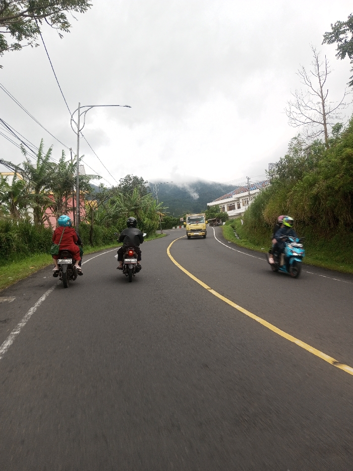 A roadway scene shows three motorcycles and a yellow truck. The motorcycles are spread across the road, with one coming toward the camera on the right. Two are further ahead. The yellow truck is in the middle of the road. The roadway has a yellow stripe. Green vegetation is on the left and right of the road. Buildings and trees are in the background. The sky is cloudy.
