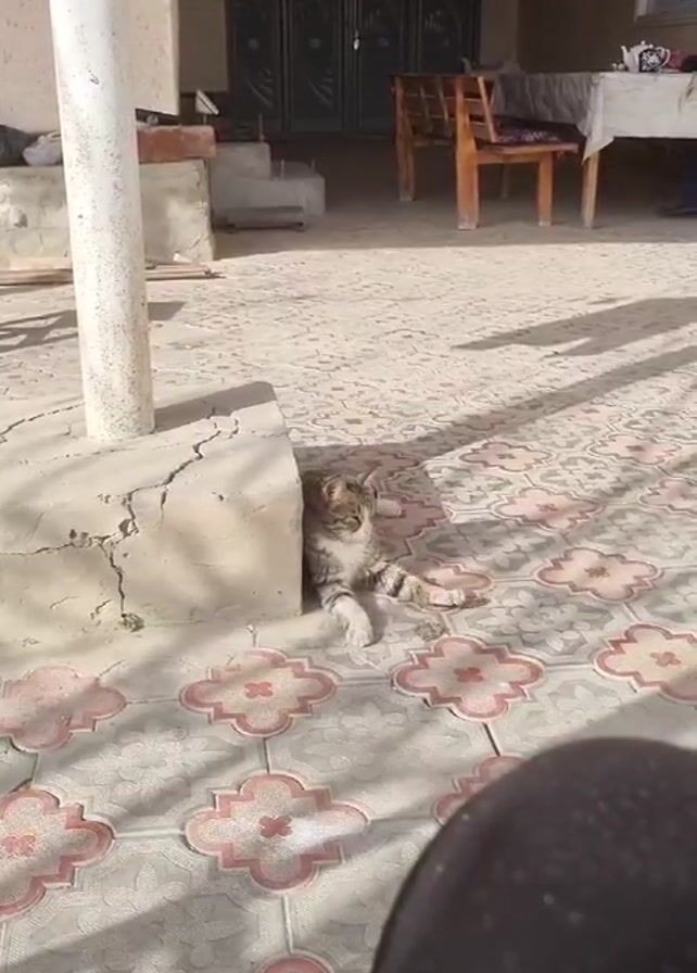 A brief video shows a cat sitting under a concrete pillar on a tiled patio