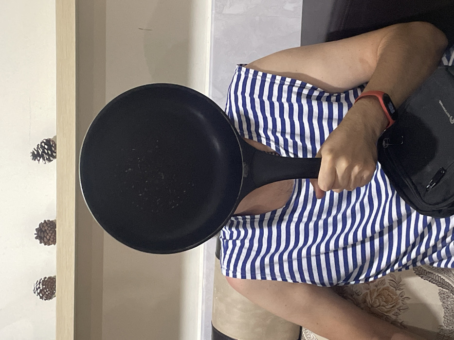 - "An individual is depicted seated indoors, holding a black non-stick frying pan directly in front of their face, obscuring it entirely" by FM-yebUD2, licensed under CC BY 4.0