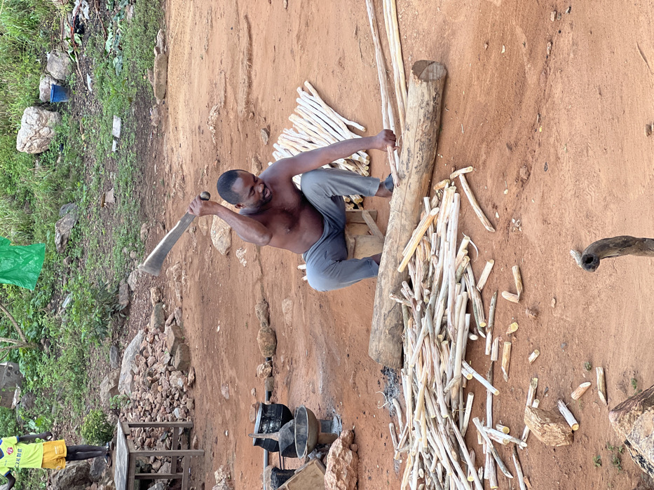 A shirtless man in gray pants squats, using a large machete to chop wood against a log. Piles of cut wooden sticks surround him on the reddish-brown ground. An outdoor cooking setup, including pots and a stove, sits nearby. Vegetation and rocks are visible in the background on one side. A person in a yellow shirt stands off to the left. The scene appears to be in a rural or outdoor setting.