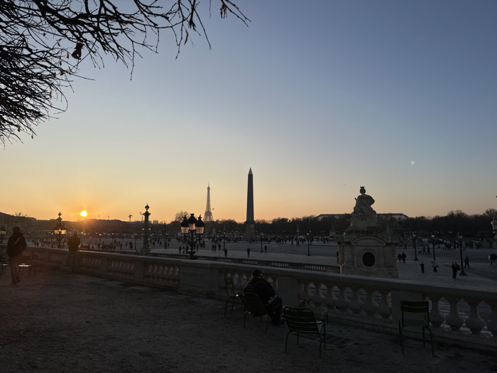 The image depicts Place de la Concorde in Paris, France, observed from an elevated position within the Tuileries Garden during either sunrise or sunset