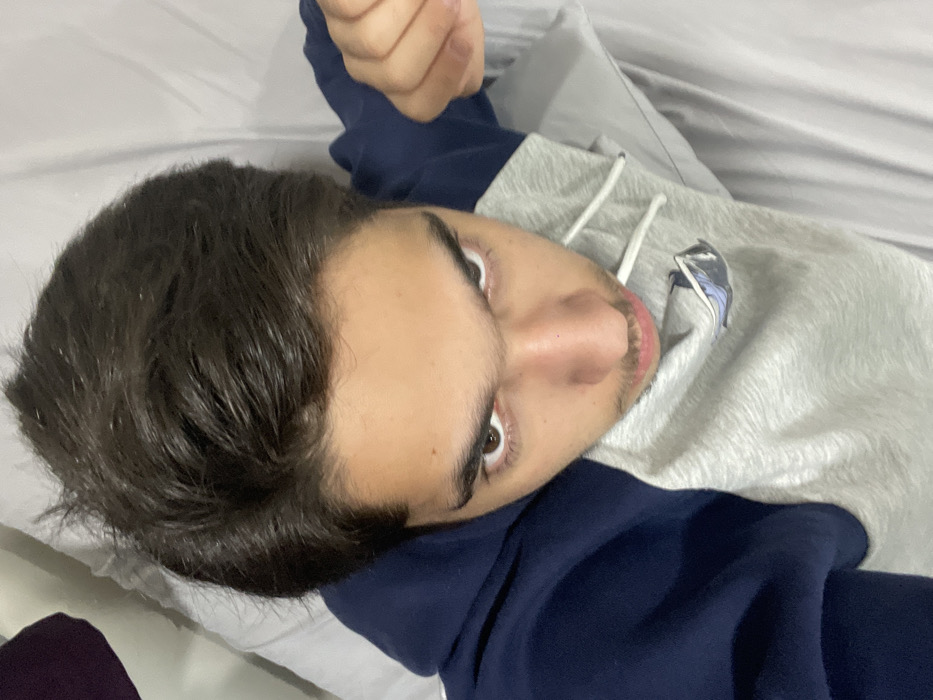 The image depicts a close-up, high-angle portrait of a single male individual in an indoor setting. The location is specified as Al-Midan Municipality, Syria, though no visual markers within the image itself confirm this geographical detail. The subject is a young adult male with short, dark brown hair and dark eyes. He has a light growth of facial hair on his chin and upper lip. He is looking directly at the camera with an intense or stern expression. He is wearing a two-tone hoodie, dark blue on the shoulders and sleeves, and light grey on the torso. The hoodie has a white drawstring and a small, stylized graphic, resembling a lightning bolt or abstract symbol in shades of blue and white, on the chest. The environment is minimalist, consisting primarily of plain white or light grey bedding, possibly sheets or a duvet, filling the right and bottom portions of the frame. A white pillow is visible in the upper left background, next to a small, blurred section of dark purple or maroon fabric. The individual's left hand is partially visible in the upper right corner, appearing to be curled into a loose fist or resting. The high-angle perspective suggests the image is a selfie.