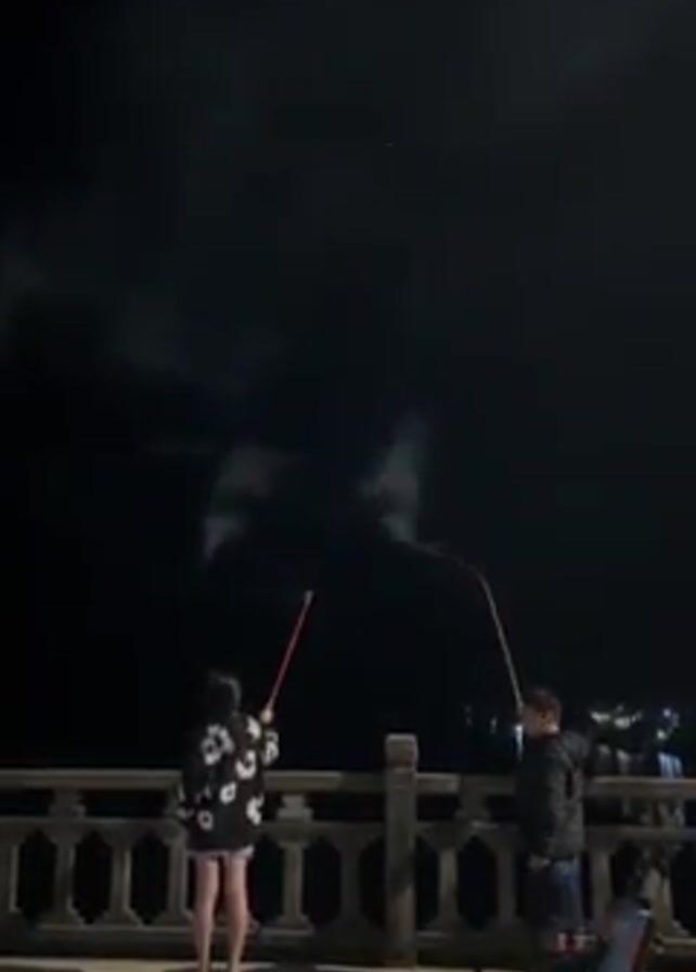 In the video, a young woman and a young man stand on a bridge or embankment at night, lighting fireworks