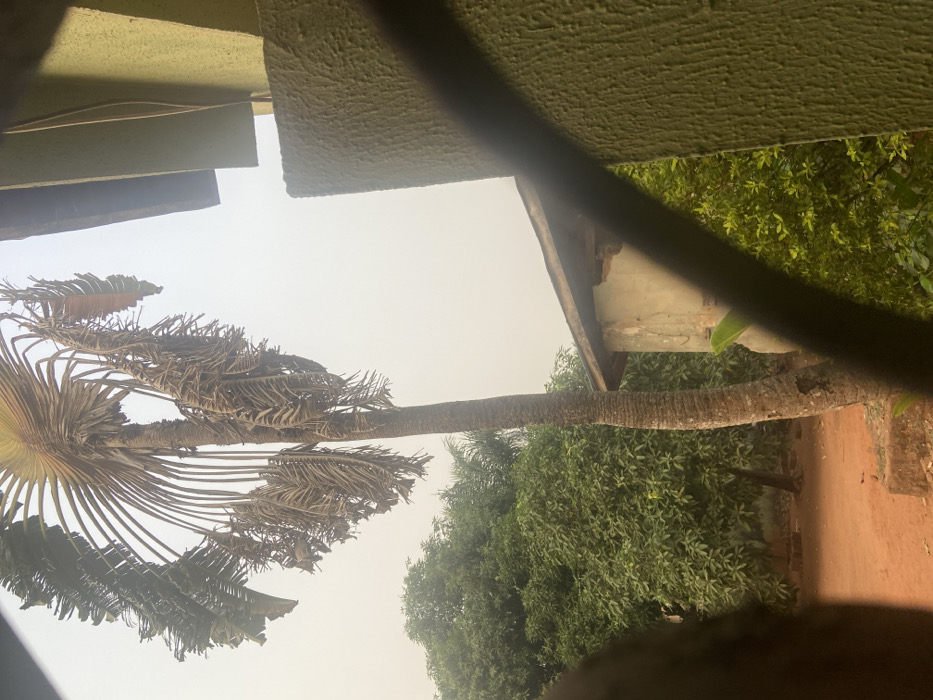 A low-angle shot reveals a decaying Traveler's Palm tree against a hazy sky. The tree's distinctive fan-shaped leaves are mostly withered and brown. A building overhangs the top of the frame on two sides. Green foliage of other trees fills the background on the right side and below the palm. A red-brown patch of ground is barely visible in the lower right. A thick black bar obstructs a portion of the view.