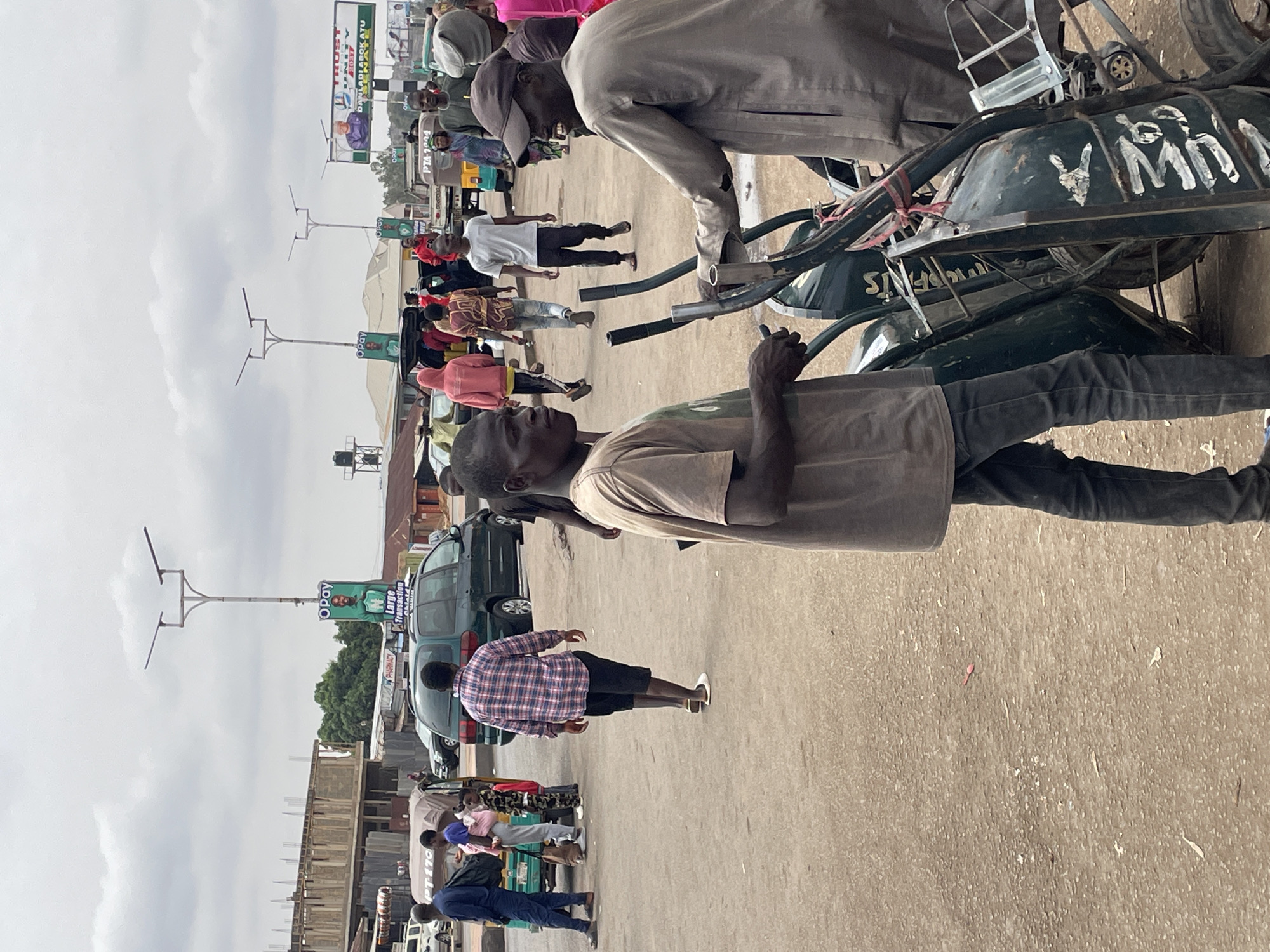 The image depicts a street scene in Jos, Nigeria. In the foreground, two men stand near a green tricycle. People are walking and standing along the street. Several vehicles are also visible, including a green van. Street signs and billboards are present in the background. Construction is underway on a building.