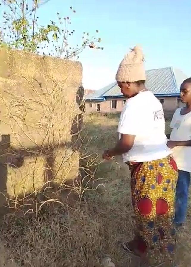A woman wearing a white t-shirt that reads "INTERDAB" and a patterned skirt is collecting dry grass with her bare hands. She is standing near a concrete block. A young boy stands behind her. The scene appears to be outdoors in a field with dry grass and a few buildings in the background under a clear sky. The woman collects the grass, gathers it in her hands, then appears to place it in a white plastic bag she holds. The video ends before her action is clearly completed.