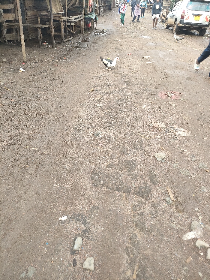The scene depicts an unpaved, uneven dirt and gravel path in Juja ward, Kenya, exhibiting damp patches, scattered litter, and small stones. On the left, a row of weathered, makeshift market stalls constructed from raw wooden planks extends into the background. A black and white Muscovy duck stands facing right in the mid-ground. To the right, the lower legs of a person in white sandals are visible, indicating movement. Further down the path, multiple individuals are walking; one person is seen in a white and green patterned top with green trousers, while others wear casual attire. A small, light-colored bird is on the ground near a white SUV with a visible yellow rear license plate, positioned on the far right side of the path, either parked or moving slowly. The environment suggests an active, informal market street.