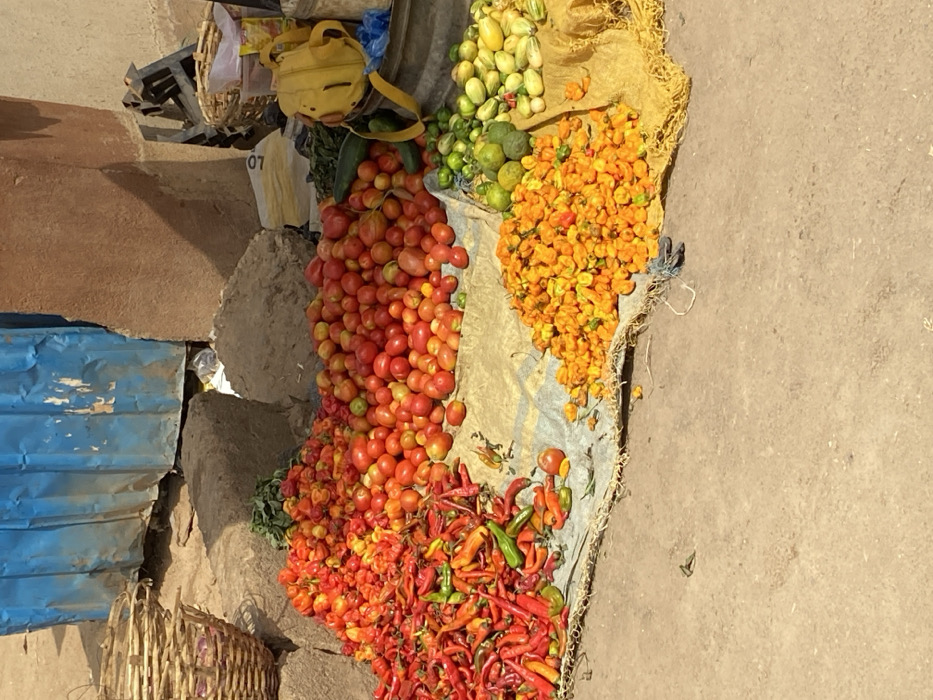 The image depicts an outdoor market stall in Jos, Nigeria, presenting a variety of produce on the ground