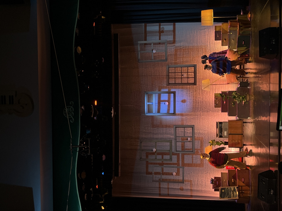 A stage features a textured backdrop adorned with various window frames. A man in a red sweater and tan pants stands to the right, near a stack of vintage suitcases and lamps. Another man, in a blue plaid shirt and brown pants, sits on a chair by a similar stack of suitcases. Stage lighting casts an orange hue, with a blue spotlight on the middle window frame. The left side of the stage has a dark panel with musical symbols and hanging decorations.