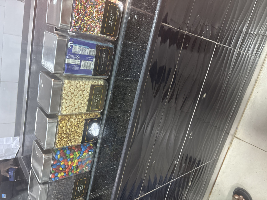 This image depicts a commercial counter display, identified as being in the city of Jos, Nigeria. Six clear, rectangular containers with brushed metal lids are arranged in a row on a dark, speckled countertop. From left to right, the containers hold: dark chocolate chips (labeled "DARK CHOCOLATE CHIPS"), colorful M&M's candies, shelled peanuts (label obscured by reflection), white chocolate chips (labeled "WHITE CHOCOLATE CHIPS"), crushed Oreo cookies (labeled "OREO COOKIES," with blue packaging visible inside), and rainbow sprinkles (labeled "RAINBOW SPRINKLES"). Below the countertop, a dark, possibly black, tiled vertical surface with a distinct wavy, textured pattern and light grout lines is visible. In the upper left quadrant, a dark-skinned hand and forearm are partially visible, extending from the left and appearing to interact with an object out of frame. A white paper bag is visible in the background. In the lower left quadrant, a foot wearing a black flip-flop is partially visible on a light-colored tiled floor. The scene is brightly lit.