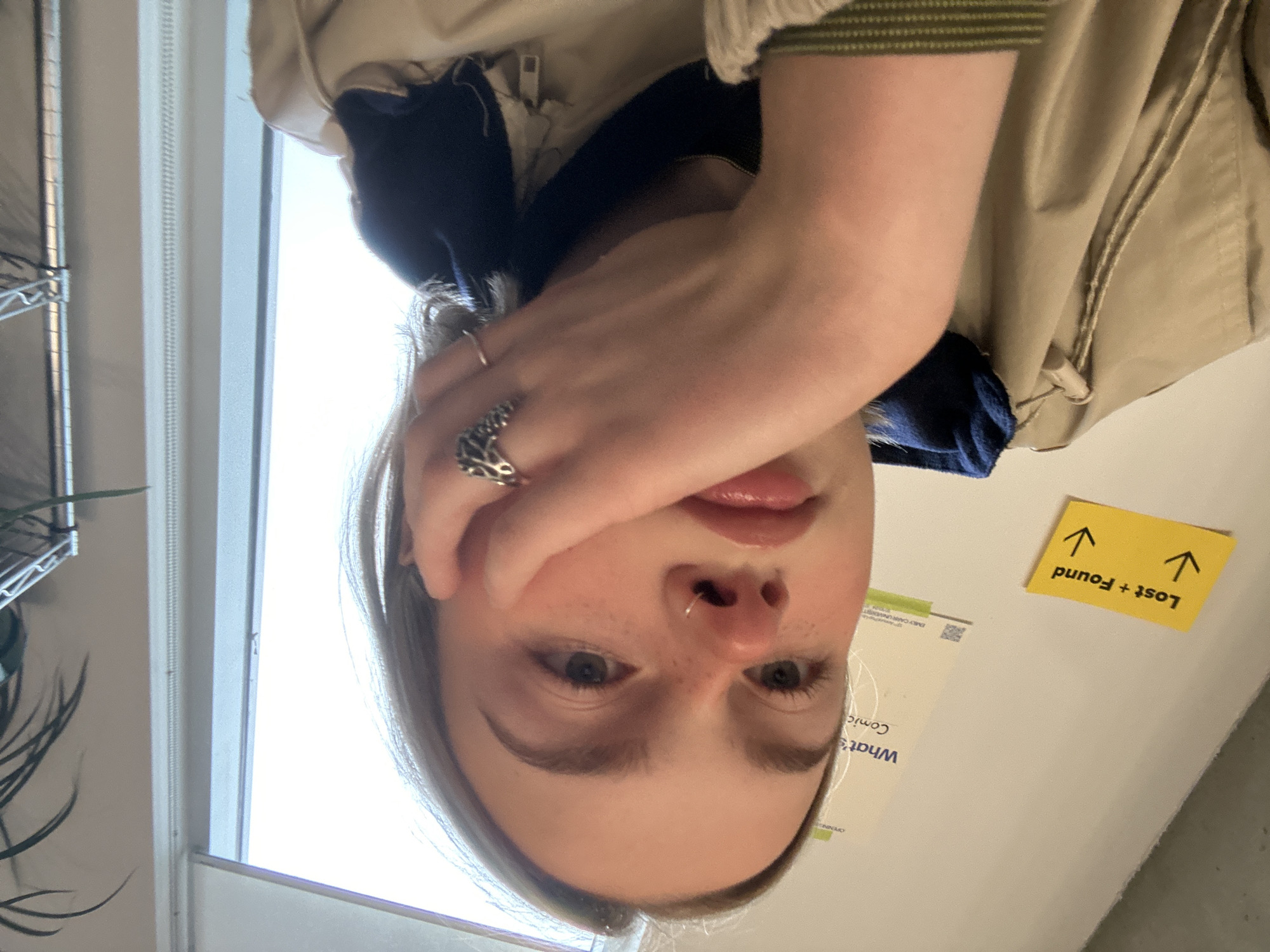 A young individual is depicted in a close-up, chest-up shot within an interior setting identified as Emily Carr University of Art + Design in Vancouver, British Columbia, Canada. The individual, with fair skin, light hair, and visible freckles across the nose and cheeks, gazes directly forward. A silver-colored hoop nose piercing is present on the right nostril. The left hand supports the left side of the face, with the thumb near the mouth and fingers extending upwards towards the temple. A silver-toned ring, shaped like an animal (possibly a snake or dragon), is worn on the left index finger. The individual is dressed in a light tan or beige jacket with a dark blue collar visible underneath. A striped cuff, primarily green and tan, is visible on the left wrist. The background features a light-colored wall with two affixed items. To the left, a yellow rectangular sign displays "Lost + Found" in black text, accompanied by two downward-pointing arrows. To the right of the sign, a partially visible white poster contains text, including "What's," "Comic," and "EMILY CARR UNIVERSITY," confirming the location. Further right, a large window allows bright, diffused light into the space, and a sliver of a metal shelving unit holding a green potted plant is visible near the frame's edge.
