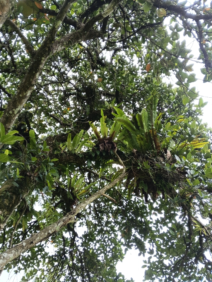 The scene depicts a low-angle view upwards into the dense canopy of a large tree located in Trairão, Brazil. The tree exhibits thick branches, heavily covered with moss and lichen, supporting a robust growth of vibrant green foliage. Multiple large epiphytic ferns, characterized by their broad, wavy fronds, are prominently attached to the branches, particularly in the central frame. A large, ovoid, light-green fruit with a spiky texture, consistent with a jackfruit, is visible in the upper-left quadrant. Patches of bright white sky are discernible through gaps in the canopy. No individuals, animals, or artificial structures are present.