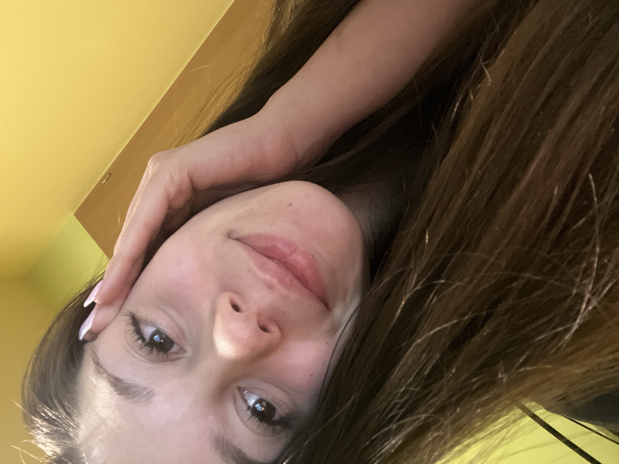 A close-up, slightly angled shot of a woman's face. She is fair-skinned with brown eyes and brown hair. Her right hand is positioned near her forehead, with manicured nails visible. The background features a yellow wall or surface. The location is unknown and could not be determined to be in Sofia, Bulgaria.