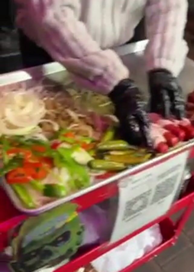 Here's a breakdown of the video's content: A person wearing a light-colored sweater and black gloves is preparing food on a red cart