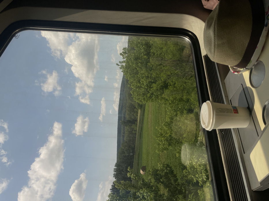 - "view from inside a train, looking out the window at a green field with a hay bale in the distance" by FM-jELPV2, licensed under CC BY 4.0