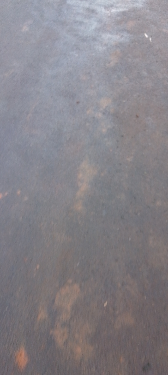 The scene, located in Ngong ward, Kenya, depicts an overhead view of a uniformly textured, dark grey paved ground surface. Irregular patches of lighter grey and reddish-brown discoloration are visible across the surface, suggesting wear, staining, or variations in material composition. Small, white to light-colored specks are scattered sparsely, consistent with minor debris or reflective imperfections. No individuals, identifiable objects beyond the pavement, or specific actions are discernible within the frame.