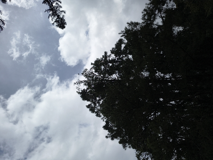 trees and sky with clouds. Trees are dark and dense, primarily on the right side of the frame and some on the top left. The sky, filled with white and gray clouds, occupies a significant portion, mainly the left side. The perspective appears to be looking up into the trees.