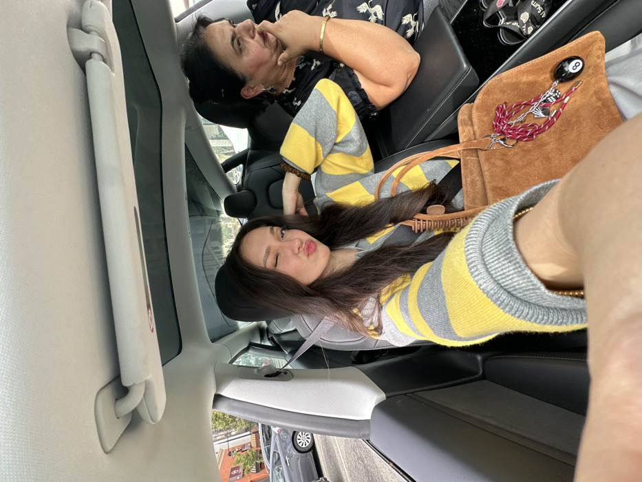 Two females are depicted inside a parked or slow-moving vehicle, identified as a Tesla Model 3 or Y due to its panoramic glass roof and interior design elements. The scene is set on a street in Glendale, United States, visible through the car's windows with buildings and other vehicles parked along the curb. In the front passenger seat, a young adult female with long, dark brown hair wears a yellow and gray striped long-sleeved sweater over a light-colored collared shirt. She is taking a selfie, holding the camera (presumably a phone) with her right hand, which extends into the foreground. Her head is tilted, and she is making a "kiss" face with pursed lips, winking with her left eye. A brown hair claw clip is affixed to her sweater collar. On her lap, a brown suede-like tote bag rests, featuring a complex keychain with red beaded elements, a miniature deck of playing cards, and a black eight-ball charm. Seated directly behind her in the rear passenger seat is an older adult female with dark hair pulled back. She wears a dark-colored top with a light-patterned design. Her right hand is raised, with her fingers resting under her chin, indicating a contemplative or observational posture. She is not directly interacting with the camera. A gold-colored bracelet is visible on her left wrist. The car's interior features a light-colored headliner and dark gray seats. Outside the front passenger window, an urban environment is visible, including a brown building with an awning and other parked vehicles on the street. The lighting suggests it is daytime.