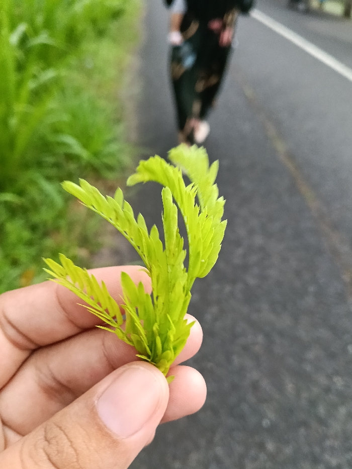 A person holds a sprig of bright green leaves with many small leaflets, likely newly sprouted. The background is blurry, showing a paved road and greenery on the roadside. A person wearing dark clothing is walking away on the road, out of focus. The focus is on the detailed texture and shape of the leaves being held. The light is soft, highlighting the vibrant green color.