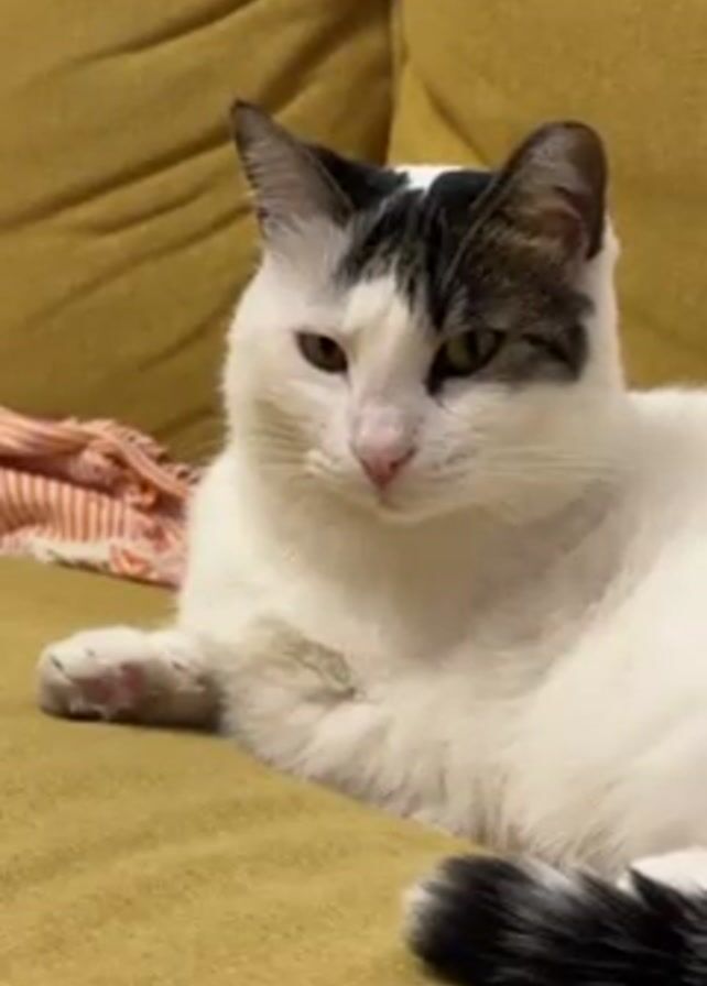 - "A white cat with black markings lays on a yellow couch" by FM-YF4DR2, licensed under CC BY 4.0