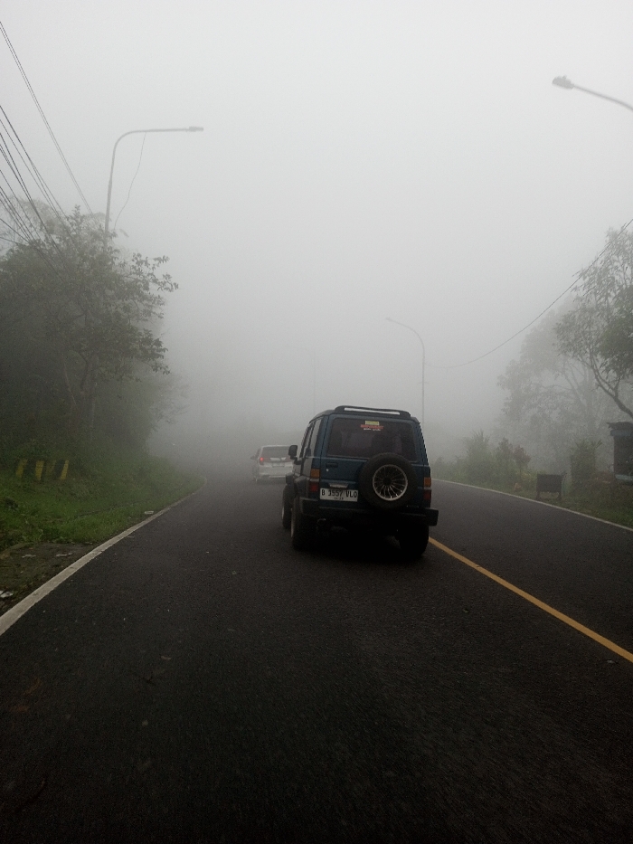 - "A dark blue SUV is driving on a winding asphalt road with a solid yellow line, almost disappearing into the thick fog ahead" by FM-AX1Wz1, licensed under CC BY 4.0