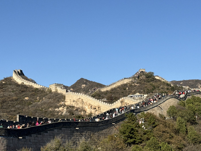 The image displays a densely populated section of the Great Wall of China, situated in Yanqing District, China, likely at the Badaling site. Under a clear, bright blue sky, the stone and brick wall, featuring crenellated parapets and multiple watchtowers, snakes across a mountainous landscape. The terrain is characterized by hillsides covered in sparse, autumnal-toned vegetation and exposed rocky formations. Hundreds of individuals, primarily tourists, occupy the wall. On the right side of the frame, a particularly steep incline of the wall is filled with a continuous stream of people, mostly ascending. Other groups are visible further along the wall's path on various distant segments and watchtowers. Individuals are engaged in walking and observation, dressed in varied casual attire appropriate for outdoor activity. The scene illustrates a historical monument experiencing high visitor traffic.